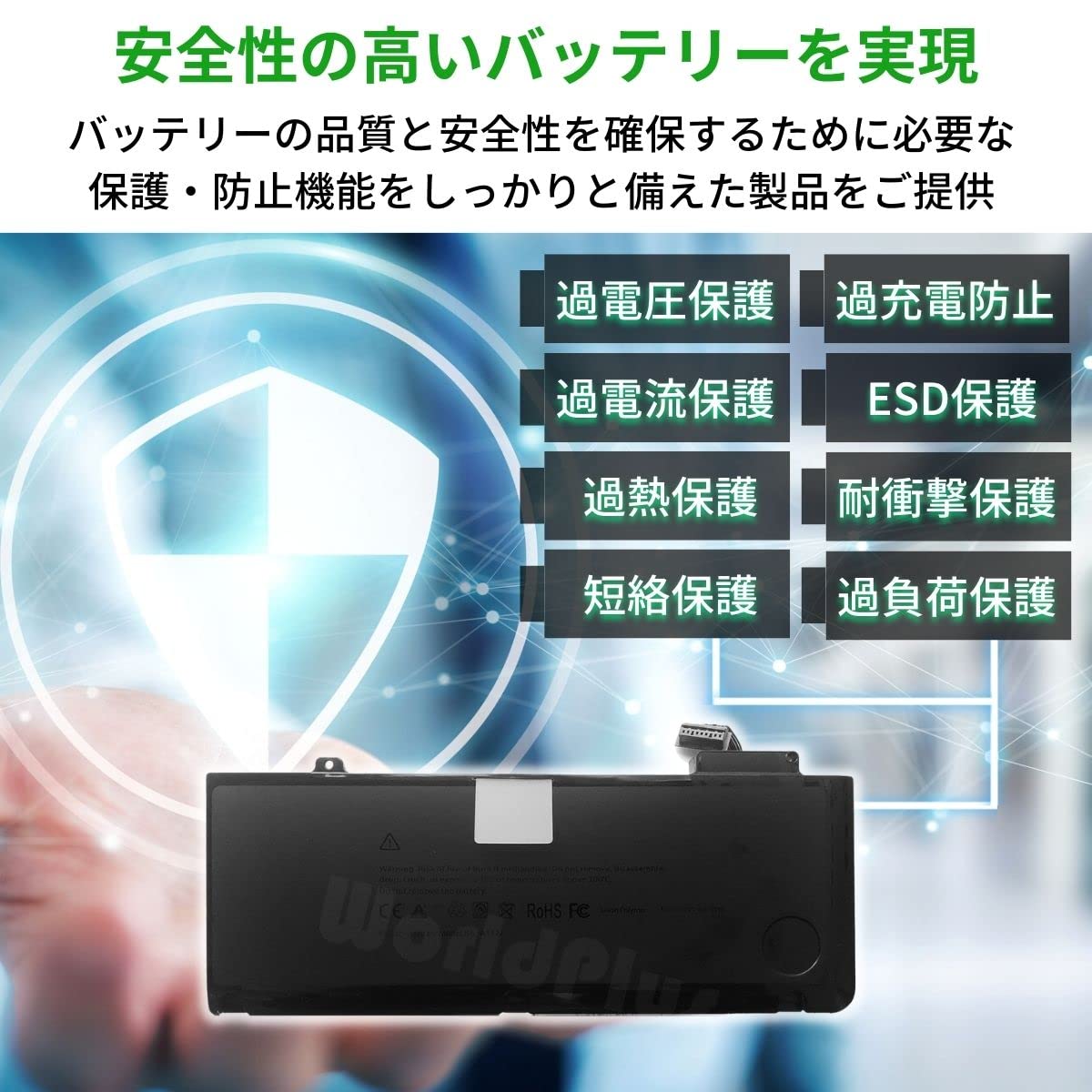 ◆日本独自の高い安全基準(PSE)に適合済。◆万全な防止機能:過電流保護・過充電防止・過放電防止、短絡保護などの機能付き。
