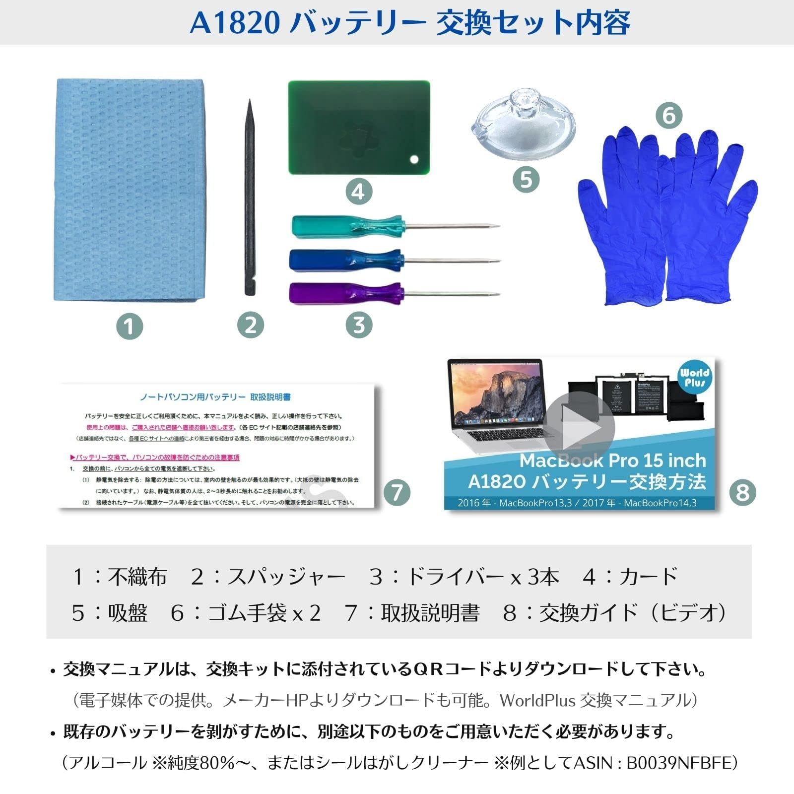 ◆交換セットが付属。バッテリー交換に必要な各種工具類が一通り付属します。※シール剥がし等、別途ご自身で準備するものもあり。詳細は本ページ下部の「商品の説明」を参照。